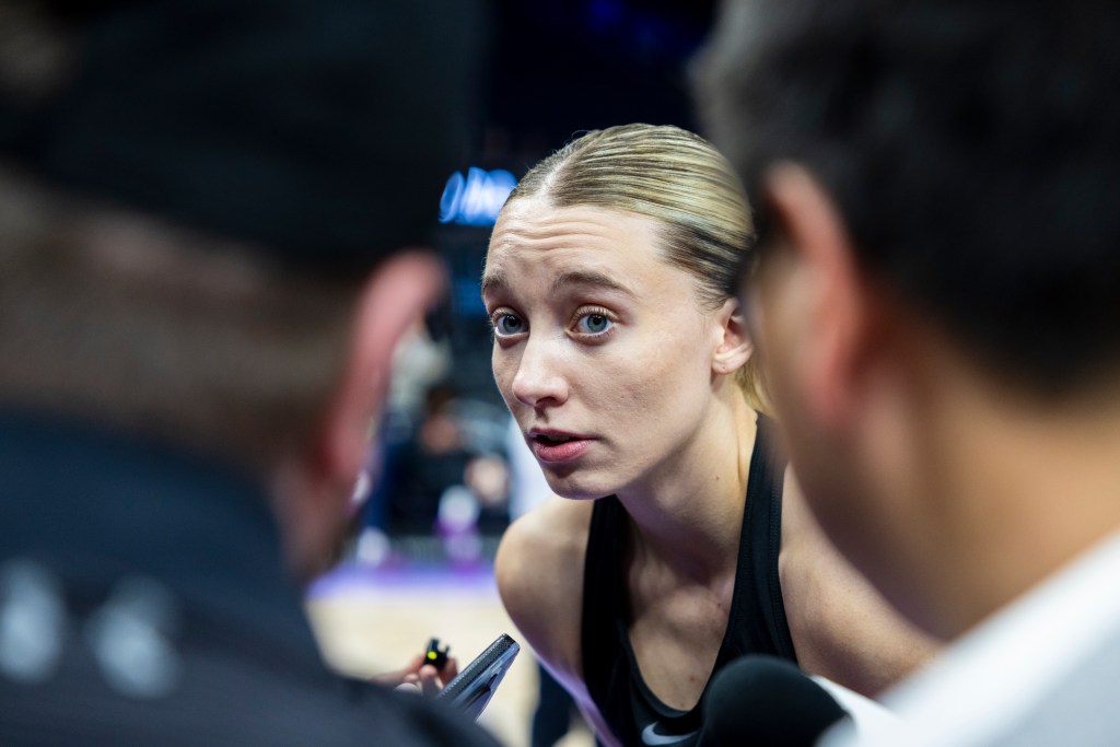 Dallas Wings guard Paige Bueckers addresses members of the press ahead of her team’s game against the Golden State Valkyries in San Francisco on July 25, 2025. The Valkyries won against the Wings 86-76 despite being short of All-Star Kayla Thornton due to a right knee injury.