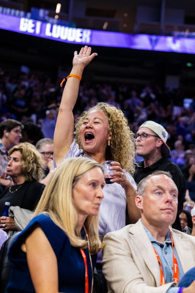 A Golden State Valkyries fan celebrates a score during the team’s game against the Dallas Wings in San Francisco on July 25, 2025. The Valkyries won against the Wings 86-76 despite being short of All-Star Kayla Thornton.